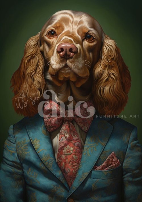 The decoupage paper design playfully blends the world of fashion with the whimsical nature of pets, inviting you to appreciate the unique character of our furry friends. It’s not just a portrait; it’s a conversation starter, perfect for dog lovers and art enthusiasts alike. The rich colours and textures create a warm atmosphere, making it an ideal focal point for your living room, office, or any area that could use a touch of charm.